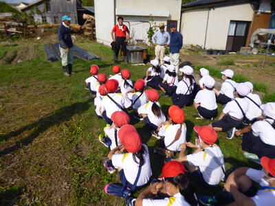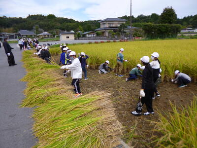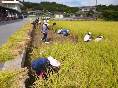 今日は、5年生が稲刈りを体験しました。6月に自分たち田植えをした苗が大きく育ち、稲が立派に実っています。5年生の児童は、一人一人カマを使用して一生懸命稲刈りをしてくれました。