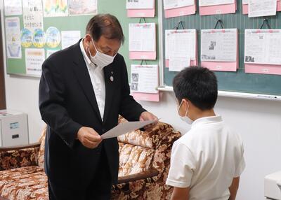 本日はクリーンパークファイブから募集があった環境ボスターの優秀賞の表彰が本校でありました。例年はクリーンパークファイブで表彰式が行われていたとのことですが、今年は新型コロナウイルス感染対策のために、各学校で表彰をされているとのことです。本日は、長洲町長様が来校され、校長室で本校4年の二人の児童(受賞者)に表彰状と記念品を渡していただきました。