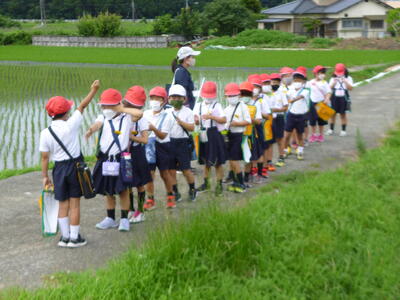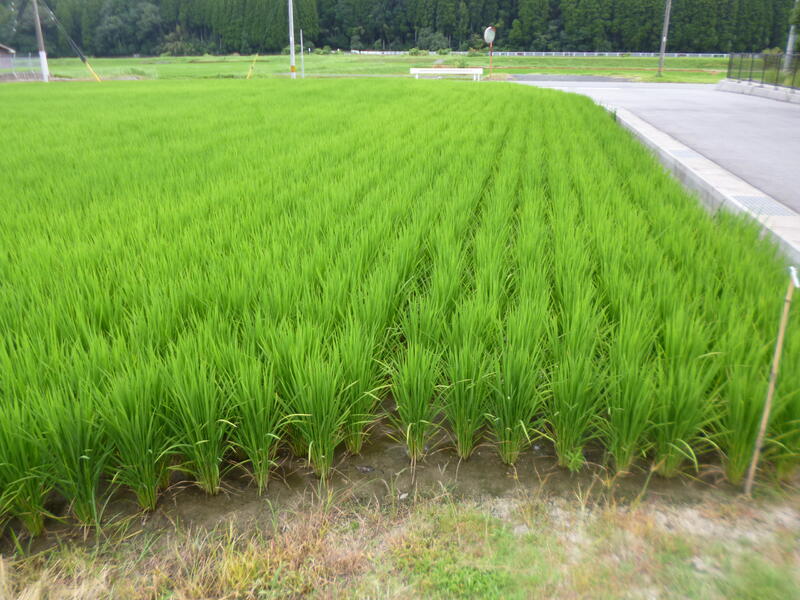 6月20日に5年生が、体育館横の田に植えた稲が大きく成長しています。秋の収穫も楽しみになってきました。