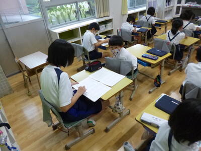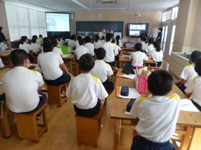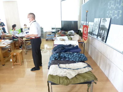 6年生が修学旅行の事前学習として、平和学習を行っています。今日は、本校の司書である髙谷先生に「地域に残された戦争の傷跡を知ろう! 戦時資料で体験しよう!」と題して講話をしていただきました。子供たちは、地域に残された戦争の傷跡から、「平和」の大切さについて考えていました。