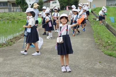 2年生が生活科の学習で、「生き物となかよし 大さくせん」と題して、学校近くの水田周辺に出かけ、たくさんの生き物を見つけていました。