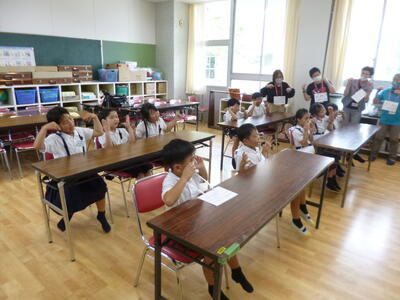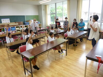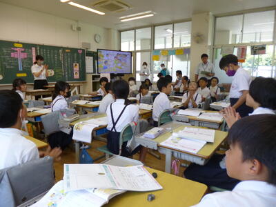 本日5限目に、熊本県教育委員会主催で第1回英語授業づくりプロジェクト研修が本校で実施されました。5年2組の英語の授業でしたが、子どもたちの意欲的な態度に参加された先生方が関心されておられました。