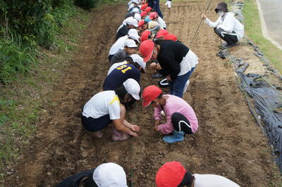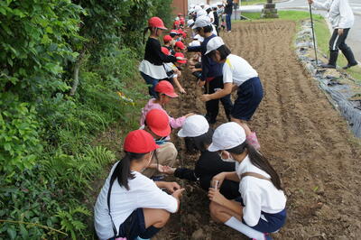 3年生が総合的な学習の時間に「大豆の学習」を進めています。今日は、「丸美屋」さんから、二人の講師の先生をお招きし、大豆の種まきをしました。一週間から10日ほどで芽が出るとのこと。畑の土が少し硬く、芽がちゃんと出てくれるか心配ですが、楽しみに待っています。