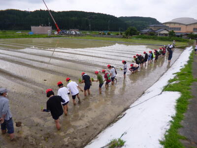 6月23日(金)の1時間目に5年生が田植えの体験をしました。地域の方のご協力とご指導のもと、学校近くの田んぼで田植えの仕方を教えていただき、実際に体験をさせていただきました。稲の成長が今後楽しみです。