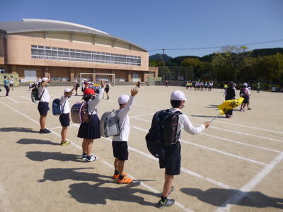 4月12日の5時間目に「地区児童会」が行われました。地区ごとに集合して、登校班の確認と通学路の確認などを行いました。終了後、運動場で道路(横断歩道)を渡る練習をしました。