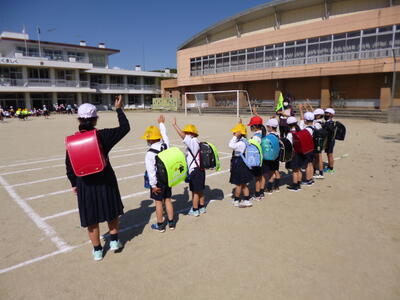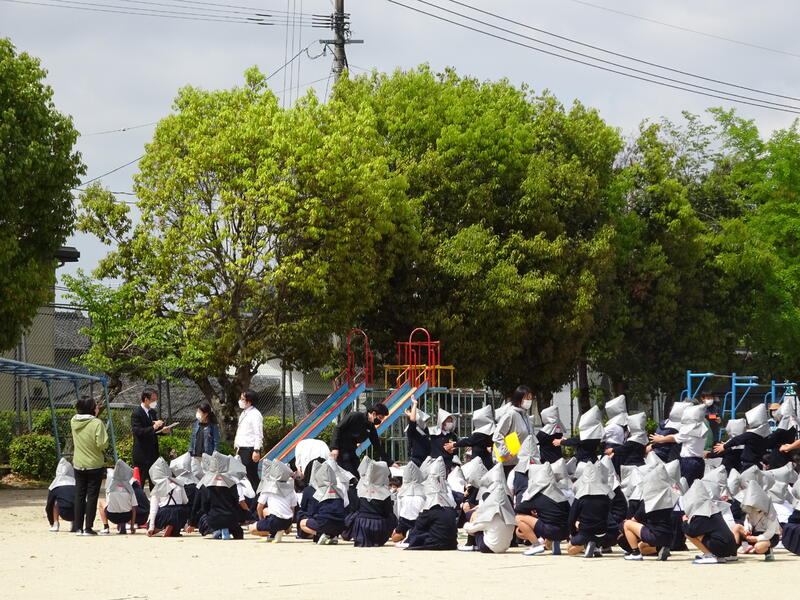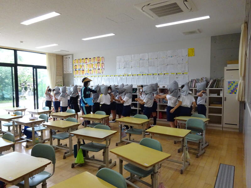 本日の3校時に、いつ起こるか分からない地震から尊い命を守るため、避難訓練を実施しました。「地震発生」の放送で机の下に身をかくし、揺れかおさまってから防災ずきんをかぶり、運動場に避難しました。命を守るために大切な「おさない、かけない、じゃべらない、もどらない」の約束事を確認し、訓練を終わりました。