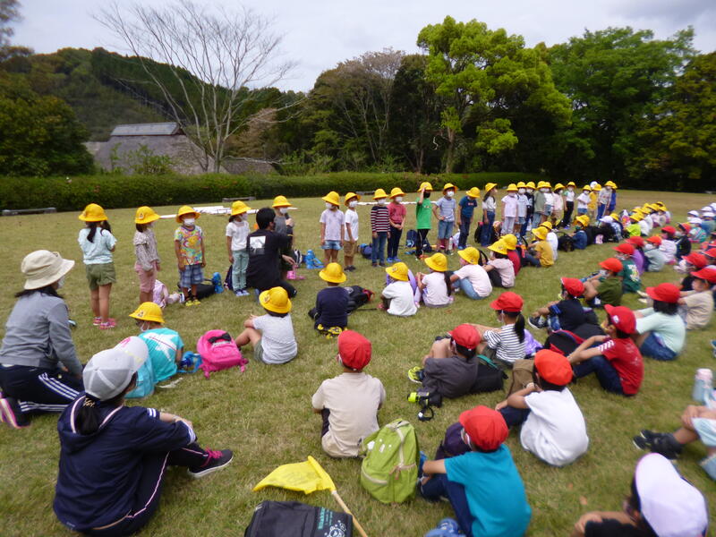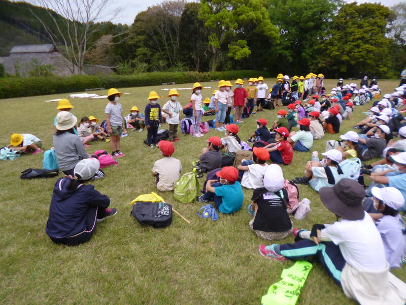 今日は歓迎遠足でした。古墳広場に到着すると、歓迎行事があり、1年生が自己紹介をしてくれました。写真は、1年生が自分の名前と好きな食べ物を紹介してくれている様子です。