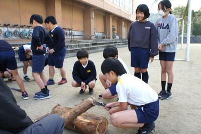 4年生が、緑の少年団として体験学習に取り組みました。まず、丸太切りに挑戦しました。子どもたちは、のこぎり引きになごみんの応援を受けながら悪戦苦闘していました。次に門松づくりにチャレンジ。きれいな門松ができあがりました。