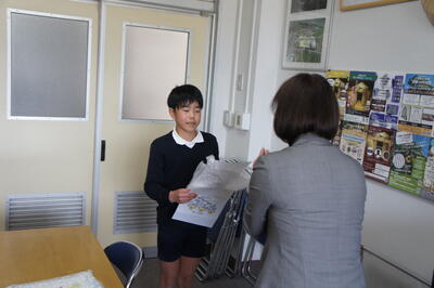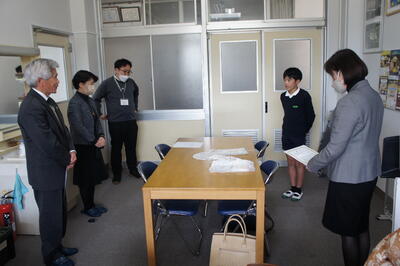 税に関する絵はがきコンクールで本校6年生の児童が優秀賞となり、3月4日(月)に玉名法人会より3名の方が来校され、表彰式を実施していただきました。