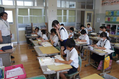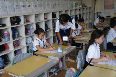 菊水中学校の生徒3名(5日のみ6名)が9月3日から5日までの3日間、本校で職場体験をします。それぞれ教室に入って、児童の支援をしてくれました。