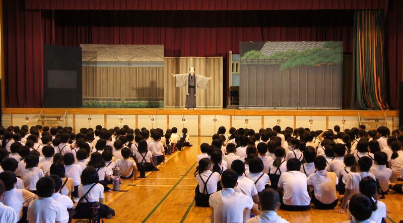 10月1日の和水町芸術鑑賞会の前日、菊水小学校体育館にて、菊水小と三加和小6年生対象に、前進座さんのワークショップが開催されました。歌舞伎の「みえ」の切りかたや殺陣(たて)について教えていただきました。