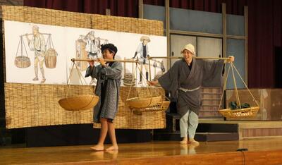 今日の芸術鑑賞会は、前進座さんの古典落語「くずーい 屑屋でござい」の公演を鑑賞しました。子どもたちも、とてもおもしろかったと喜んでくれていました。年に一度でも、このように本物に出会う機会があることは、とてもよい学びになると感じることができました。2名の児童がステージで、江戸時代の物売りを演じることができました。