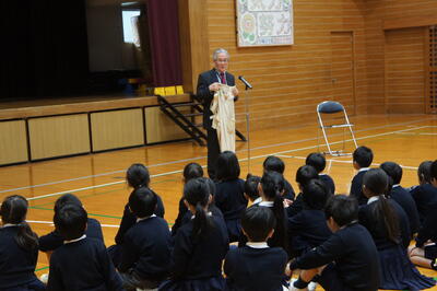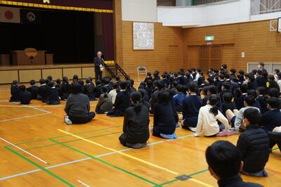 1月22日(月)の昼休み、全校児童に大谷翔平選手から寄贈されたグローブをお披露目しました。6年生の代表4名がキャッチボールをしてくれました。グローブを箱から出したときは子どもたちの歓声が上がり、とても喜んでくれました。大谷選手に感謝です。