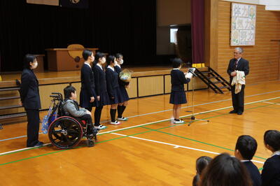 1月末日をもって、統合前から6年間にわたって本校の司書補助員として図書室のお仕事をしていただいていた高谷先生がご退職となられました。1月31日の朝、退任式を行いました。図書委員会の子どもたちからメッセージと花束を贈りました。高谷先生のおかげで本が好きになった子どもたちがたくさんいます。本当にお世話になりました。
