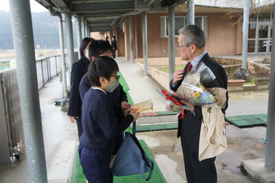 2月29日(木)の朝、本校卒業生である菊水中学校の1年生が小学校であいさつ運動をしてくれました。