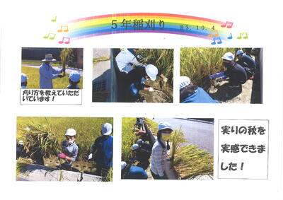 4日(月)、5年生は稲刈り体験を行いました。地域の方にご協力いただき、6月に田植えを行わせていただいた稲を刈りました。苦労しながら刈っている子ども、どんどん刈り進めていた子どもと様々でしたが、実りの秋を感じながら稲刈りをしていました。お米づくりについて、社会科で学習を進めましたが、さらに感謝の思いを強く持ったようです。