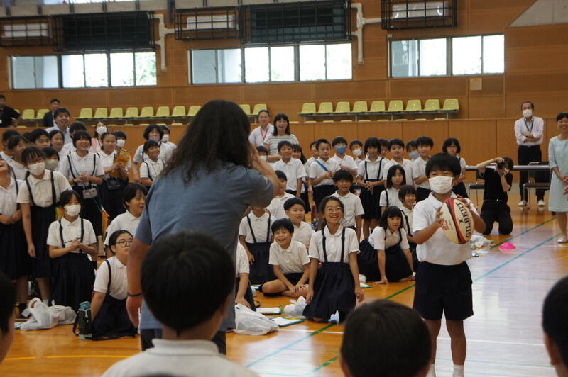 今年のなごみ夢チャレンジトークでは、大畑大介さんはじめラグビーの元日本代表の選手ら4名をお迎えし、お話を聴くことでできました。選手たちとのラグビーボールのパス体験は大盛り上がりでした。
