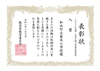 本校の朝ボランティア活動が地域社会貢献活動として認められ、「くまもとの笑顔・未来を創る児童生徒表彰」の入賞校として3月3日に熊本県教育委員会より表彰していただきました。