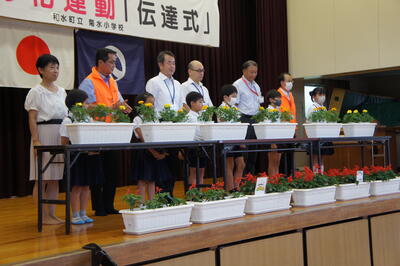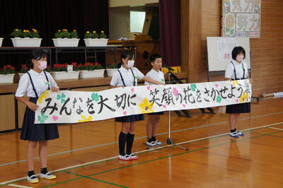 今日は「人権の花」伝達式が行われました。今年は、全児童でいただいた花を大切に育て、花の種を収穫します。そして、その種を多くの人にお届けできるようにがんばります。