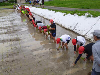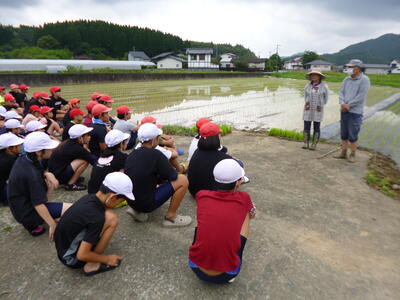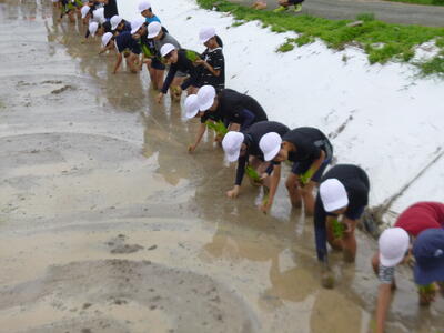 6月23日(金)の1時間目に5年生が田植えの体験をしました。地域の方のご協力とご指導のもと、学校近くの田んぼで田植えの仕方を教えていただき、実際に体験をさせていただきました。稲の成長が今後楽しみです。