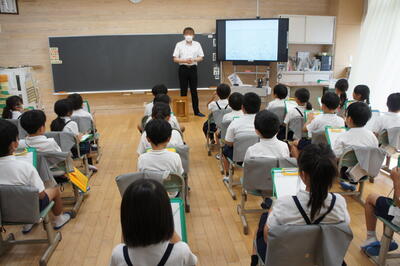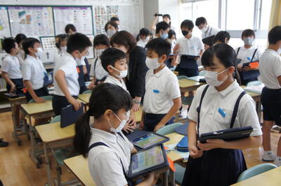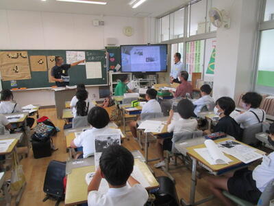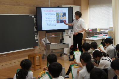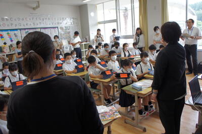 本日5限目に、熊本県教育委員会主催で第1回英語授業づくりプロジェクト研修が本校で実施されました。5年2組の英語の授業でしたが、子どもたちの意欲的な態度に参加された先生方が関心されておられました。