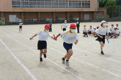 リレーのバトンパスの仕方を教えてもらったあと、練習をがんばっていました。