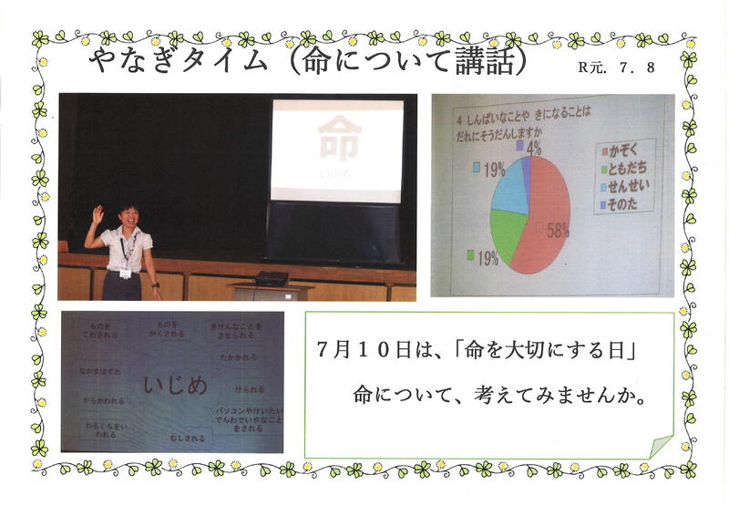 校長先生より、命についてのお話がありました。いじめとはどのようなものなのか、いじめを受けた人はどんな思いになるのかをしっかりと考えて聞くことができました。