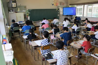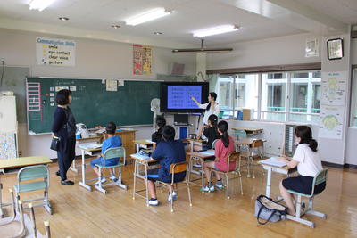 毎週水曜日は、英語学習の日です。低学年から高学年まで、全クラス英語の勉強がある日です。低学年はシャンタール先生や担任の先生、支援の先生と一緒に、英語の歌を歌ったり、家族を紹介する学習をしていました。みんな笑顔でとても楽しそうでした。3年生は北村先生と支援の先生と一緒に好きなものを言ったり尋ねたりする学習を、4年は南先生と一緒に持っている文房具を紹介する学習を、6年生は、北村先生と南先生、支援の先生と一緒に夏休みの思い出を発表するためのリスニングの学習をしていました。6年生の授業はほとんど英語だけの授業でした。みんな熱心に学習に取り組んでいました。