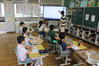 夏休み中に、電子黒板が2台導入されました。3,4年教室と5,6年教室に入れました。これまであった2台は1,2年教室と学習ルームで活用しています。新しい電子黒板は、画面も大きくいろいろな機能がついてます。まだ教師が使っている段階ですが、これから少しずつ子ども達が活用できるようにしていきたいと思います。