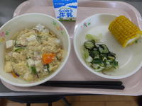玉名地方の特産物を使った料理で、麦ご飯、牛乳、南関揚げ丼の具、ゆでとうもろこし、ひともじの酢味噌あえでした。ゆでとうもろこしは、かみかみメニューです!