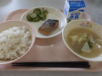 今日のメニューは、麦ご飯、牛乳、豆腐団子汁、さばの生姜煮、ごまきゅうりです。