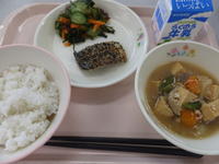 今日のメニューは、麦ご飯、牛乳、厚揚げそぼろ煮、さばの南部焼き、海藻あえです。