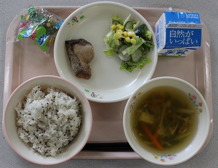 今日の献立は、麦ごはん、若竹汁、ちくわの磯辺あげ、春雨の酢の物、牛乳でした。若竹汁には、若布(わかめ)とたけのこが入っていました。若布(わかめ)もたけのこも今が旬の食材で、とてもおいしくいただきました。どのクラスもまったく残すことなくきれいに食べました。