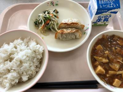 今日のメニューは、麦ごはん、牛乳、麻婆豆腐、ぎょうざ、ごま酢あえです。