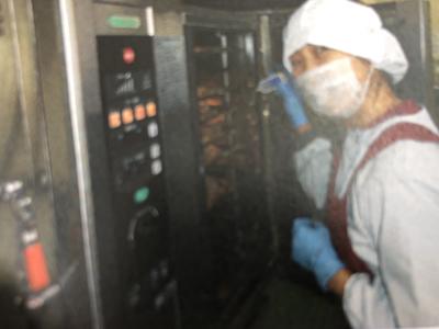 写真は、ぎょうざの中心部分の温度が85度以上になったか、温度計をさして確認しているところです。