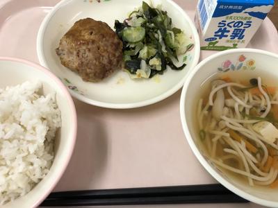 今日のメニューは、麦ごはん、牛乳、魚そうめん汁、手作りハンバーグ、海藻サラダです。