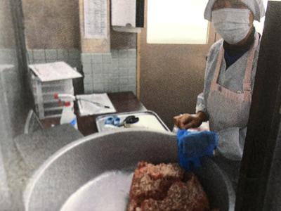 写真は、「検収」の作業をしているところです。お肉屋さんから納められた豚ミンチの温度を計り、重さを計り、容器に移し替えて異物がないか内部を確認し、保存食を50グラムとります。エプロンは肉専用のもの。、手には使い捨ての手袋をはめて行われます。