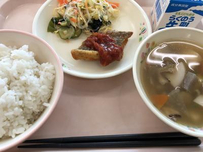 今日のメニューは、麦ごはん、牛乳、けんちん汁、魚のチリソースかけ、春雨の酢の物です。