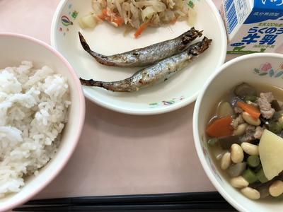 今日のメニューは、麦ごはん、牛乳、五目煮、ししゃもの香り焼き、土佐酢あえです。