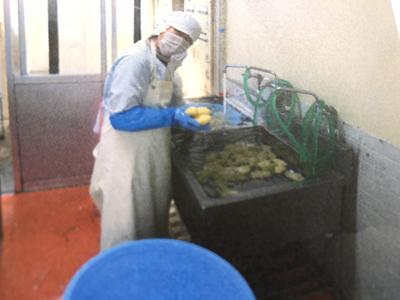 写真は、「下処理室」の様子です。ジャガイモを「球根皮むき機」にかけ、残っている皮の部分をピーラーでむいているところです。