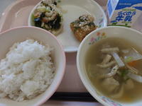 今日のメニューは、麦ご飯、牛乳、つみれ汁、豆腐のあんかけ、酢味噌あえです。