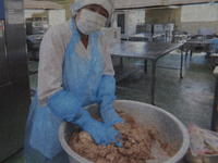 つみれ汁のつみれは、給食センターで手作りしていただいています。写真は、つみれをつくっているところで、鰯のすり身と白身魚のすり身をあわせてよくこねているところです。味が濃くてとっても美味しかったです。