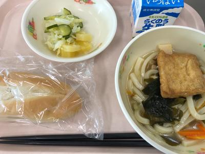 今日のメニューは、ソフトフランスパン、牛乳、わかめうどん、肉詰めいなり、パインサラダです。