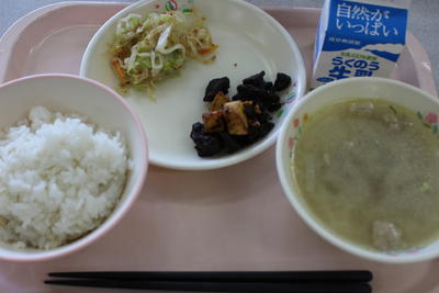 今日のメニューは、麦ご飯、牛乳、豚汁、レバーの揚げからめ、土佐酢あえです。