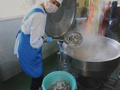 写真は、こいわし梅の香揚げを揚げる前に、数えているところです。一尾の大きさがバラバラなため、袋に入っている数は一定ではありません。だいたいの目安をつけ、揚げる袋数を計算します。今日は20袋納品してもらったものを15袋揚げたそうです。