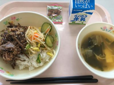 今日のメニューは、麦ご飯、牛乳、キムチ汁、ビビンバ具、一食アーモンドです。