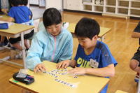 4月24日(水)、5年生の外国語活動(英語)の授業が行われました。今年から、5,6年生は週に2時間の外国語活動(英語)の授業があります。5年生では、6名の児童に対して、英語専科の北村先生、ALTの南先生、そして本校の山内先生で指導を行いました。写真は、授業の導入の部分で、2人ずつのペアになってアルファベットの復習をしています。とても意欲的に学習に取り組んでいました。