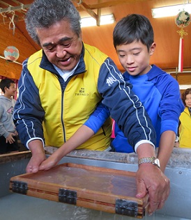 11月19日(月)、三加和公民館にて、6年生は紙漉きを体験しました。修学旅行のときに仲良くなった、西小、南小の六年生と一緒でした。一人一人が、係りの方に指導を受け、卒業証書のもととなる和紙をつくりました。この日作った和紙に、卒業証書の文言を印刷し、それぞれの名前を筆でかき、学校の印鑑をおして、世界に1枚しかない卒業証書ができます。