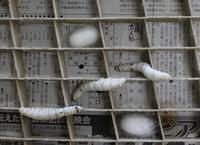 昨日から一夜明けたら、さらにまゆになっているかいこが多くなりました。それぞれ、自分の部屋をみつけ糸をはいてまゆになっていきます。黄色いのがメスで、白いのがオスとのこと。来週の月曜日には、すべてまゆになっていそうです。