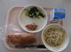 本日の献立は、焼きビーフン、魚の梅焼き、海藻サラダ、レーズンパン、牛乳でした。普段の食事で不足しがちですので、今日は給食でたっぷりとたべました。魚の梅焼きもレーズンパンも、焼きビーフンもとってもおいしかったです。